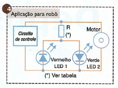 Uma aplicação interessante para um robô móvel é a mostrada na figura 4 em que LEDs vermelho e verde são usados na frente e na traseira do robô, sendo alimentados pela corrente do motor.