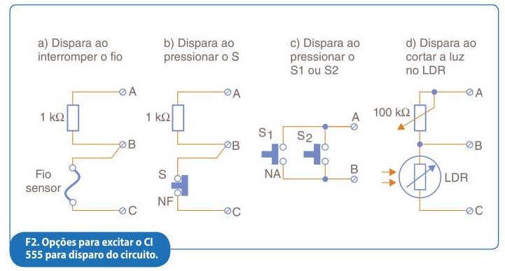 Para a utilização de um LDR temos a ligação mostrada na figura 2d. Veja que, neste caso, a momentânea passagem de uma pessoa que corte a luz incidente no LDR provoca seu disparo.