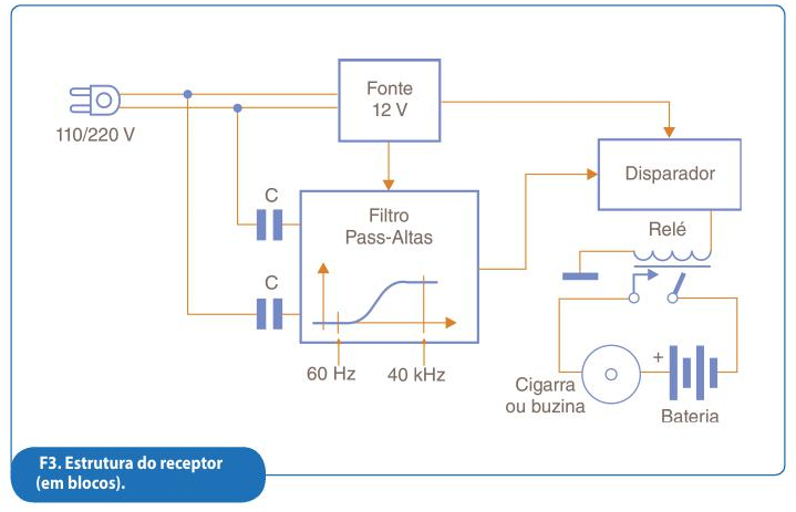 O receptor tem a estrutura mostrada na figura 3. O sinal captado da rede de alimentação, via capacitor C2 que também deve ter uma alta tensão de isolamento), é levado a um filtro passa-altas formado por C3/C4/R1/R2 e R3. Este filtro elimina, assim, o componente de 60 Hz da rede local, deixando apenas o sinal eventualmente presente do transmissor.