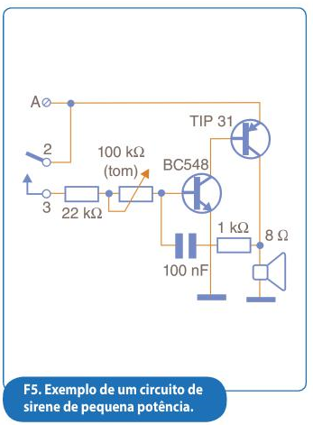 A alimentação do circuito é feita com uma fonte estabilizada que tem por base o integrado 7812, o qual deve ser dotado de um pequeno radiador de calor. Na figura 5 damos o circuito de uma sirene de pequena potência que poderá ser alimentada por este circuito.