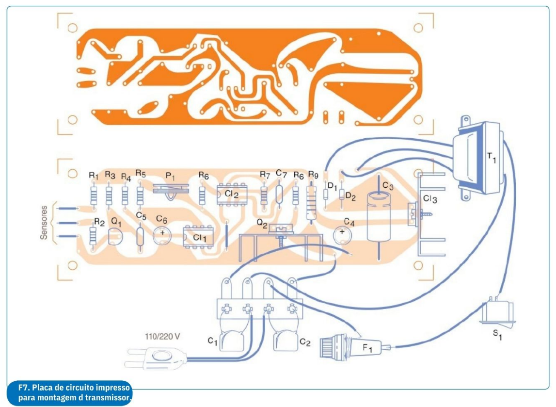 O transmissor tem um fusível de proteção em sua entrada e sua fonte de alimentação é estabilizada, tendo por sua base um integrado 7812, que deverá ser dotado de um radiador de calor.