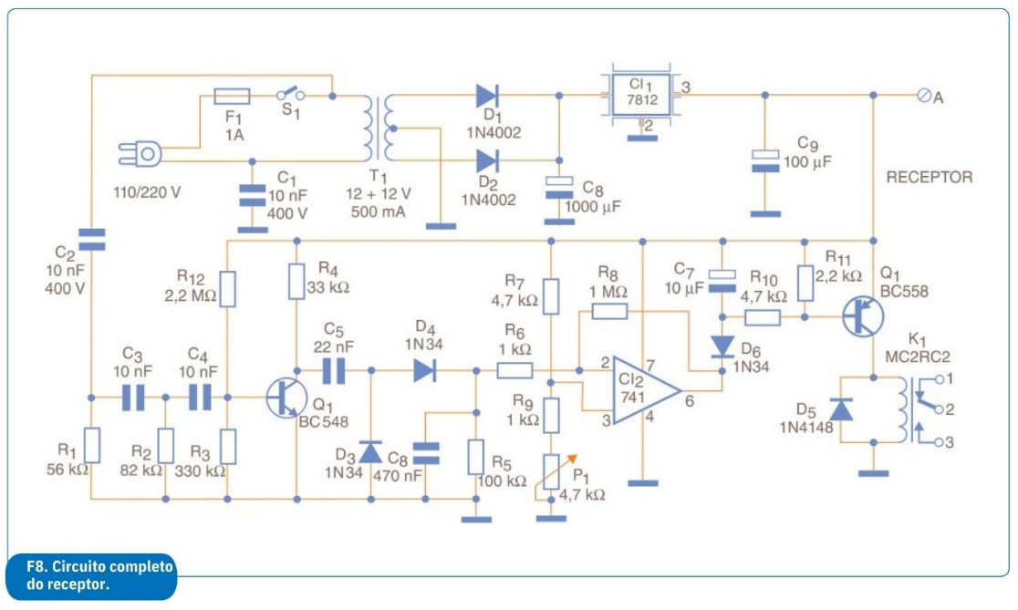 O conjunto "placa + elementos externos" pode ser instalado em uma caixa plástica que deverá ficar próxima ao local protegido e ligada à tomada de força mais próxima. Na figura 8 vemos o circuito completo do receptor.