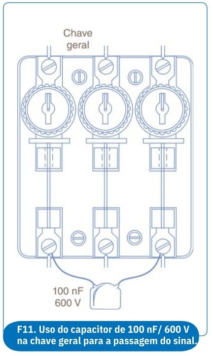 Podemos facilitar a passagem do sinal com a utilização de um capacitor de 100 nF x 600 V ligado na chave geral, conforme mostra a figura 11.