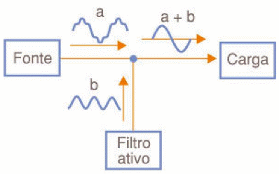 Essa corrente (que consiste na soma das correntes fundamental e harmônicas) é injetada no circuito, porém em oposição de fase de modo a cancelar os sinais harmônicos. O resultado da combinação dessas correntes é um sinal senoidal puro aplicado à carga. Veja que, este filtro faz com que no percurso entre a fonte e a carga não existam correntes harmônicas circulando. Note, então, que outros equipamentos ligados à mesma fonte neste percurso não serão afetados pela eventual presença de harmônicas na linha de alimentação.