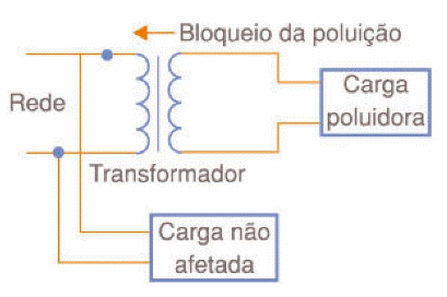 No entanto, as propriedades elétricas desses componentes também permitem que eles sejam empregados na confinação dos circuitos que alimentam equipamentos geradores de harmônicas. Um transformador pode bloquear a passagem das harmônicas de uma linha para outros trechos, afetando assim outros equipamentos que são alimentados por essa mesma linha, acompanhe na figura 8.