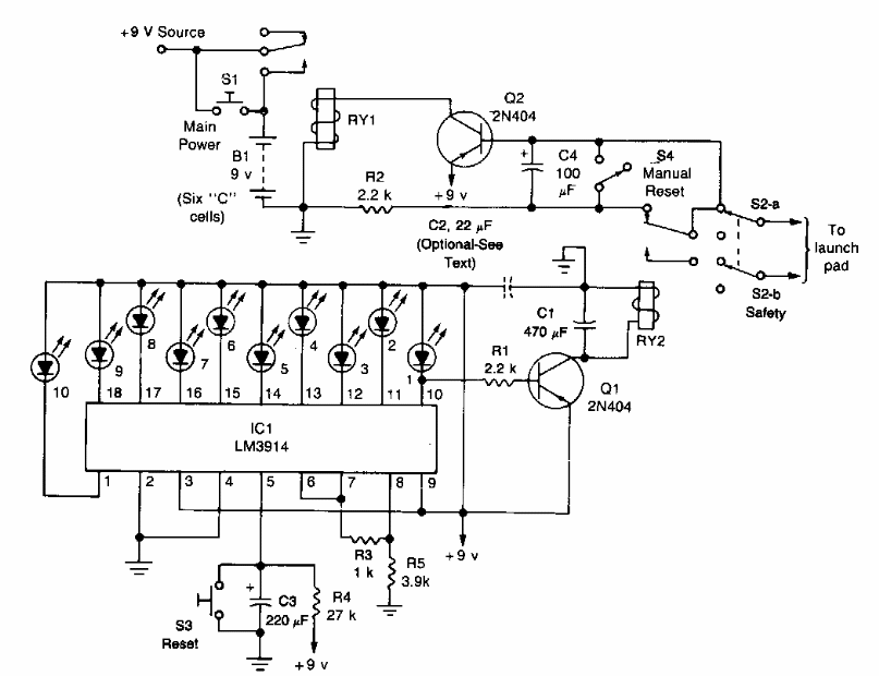Este é um outro circuito interessante que pode ser elaborado para um lançador de foguetes. Baseado no contador CMOS 4017 ele faz a contagem regressiva disparando um MOSFET no final, o qual alimenta diretamente o resistor de ignição (Ignitor). O circuito é de uma antiga Poptronics e tem componentes comuns. O FET de potência pode ser d qualquer tipo. O circuito pode ser usado com outras finalidades e a alimentação de 5 a 12 V depende da ignição. Observe a existência de uma chave de segurança que, como no projeto anterior pode ser um plugue encaixado num jaque que, sem ele conectado não é possível haver o disparo, .mesmo que a contagem regressiva ocorra.
