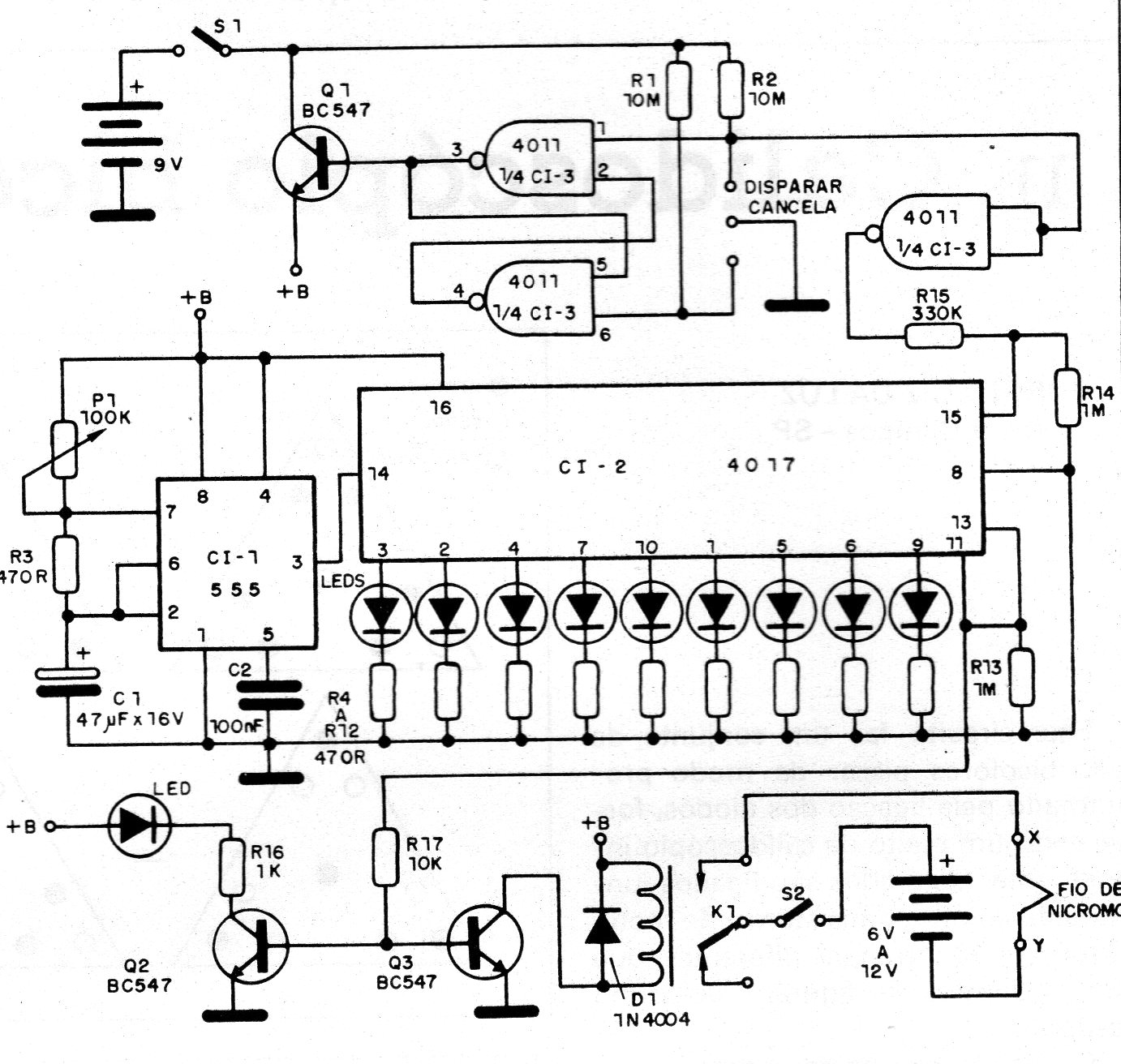 Este circuito consiste num timer que aciona um relé no final de uma programação de tempo, e depois do acionamento sequência de LEDs indicadores. O relé é usado para controlar o sistema de ignição de um pequeno foguete. A contagem regressiva tem sua velocidade ajustada pelo potenciômetro P1. O sistema de ignição é um filamento de nicromo alimentado por pilhas grandes. O circuito utiliza um 555 para gerar os pulsos da contagem que são determinados por C1 e ajustado por P1. Assim, temos um controle adicional do tempo da contagem regressiva. Também temos um botão de cancelamento do lançamento, o que pode ser útil no caso de termos de interromper o lançamento. A contagem é do tipo sequencial com o circuito integrado CMOS 4017.