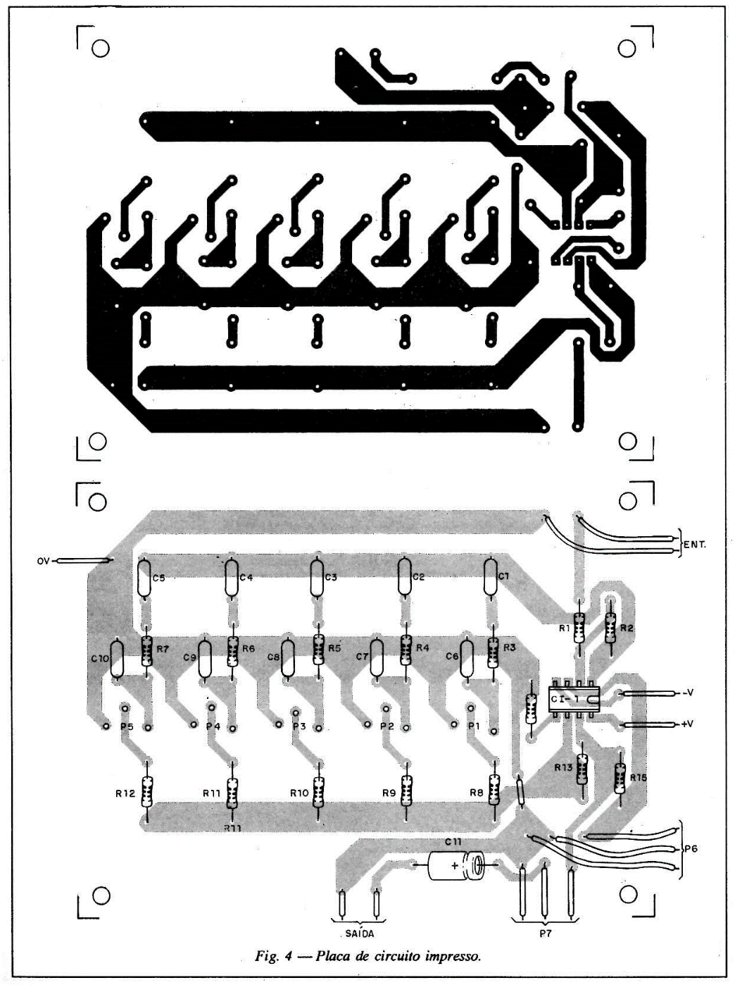 O diagrama completo do aparelho é mostrado na figura 3. A placa de circuito impresso para a versão de 5 canais é dada na figura 4 Como este tipo de circuito está sujeito a captação de zumbidos recomendamos a utilização de uma caixa metálica. O polo de 0 V da fonte deve ser ligado a esta caixa de modo que ele passe a servir de blindagem.