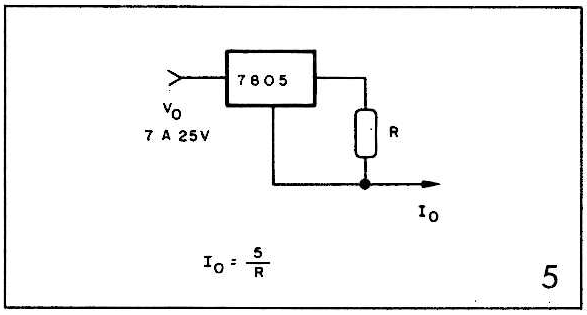 A tensão V, neste caso, é fixa e é dada pelas características do integrado. Como usamos um regulador de 5V (7805), o valor de V será 5. Para o 7806 o valor será 6, e para o 7812 o valor será 12. É fácil perceber que se R for de 52 a corrente na saída será constante, de IA, que é o valor máximo que o componente admite.