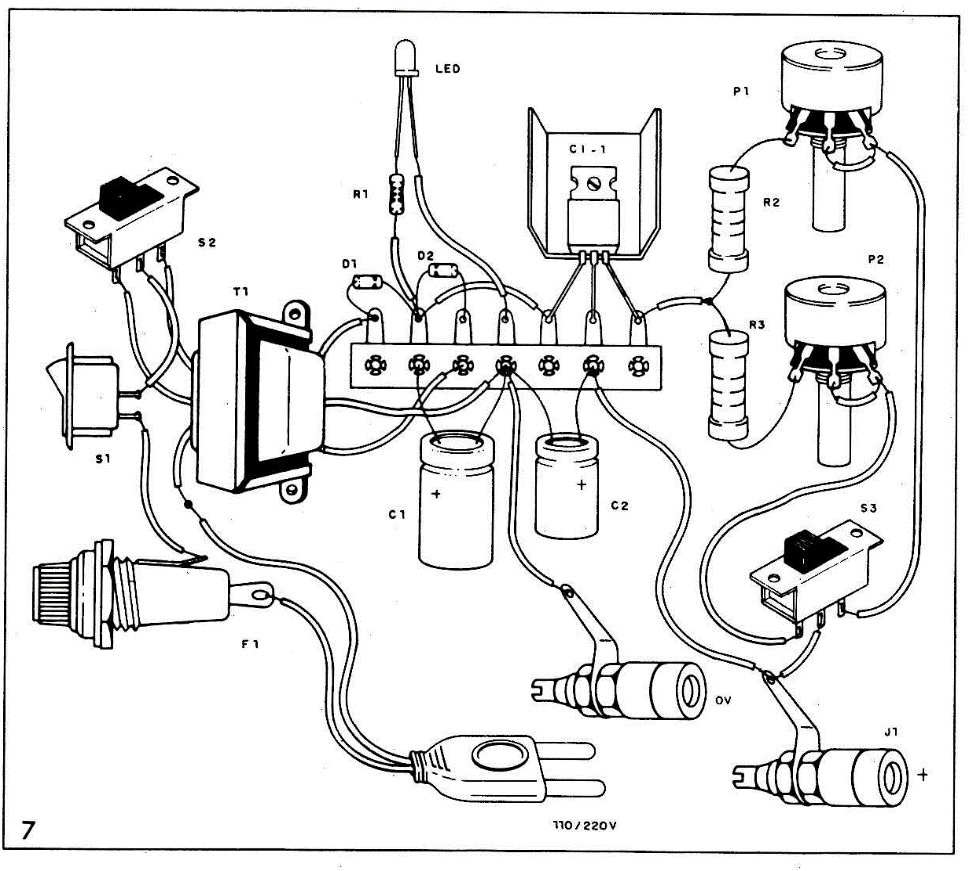 O integrado pode ser o 7805 ou 7806. No caso do 7806, partindo das explicações na parte inicial do artigo, devemos calcular os novos valores da escala. O resistor R1, que determina o brilho do led, é de 1/8 ou 1/4W, mas R2 e R3 devem ser resistores de 1W de carbono.