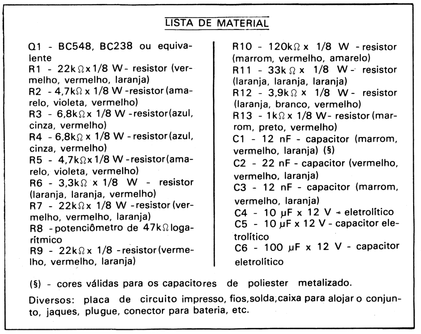 Para esta montagem, em vista da operação com sinais de pequena intensidade que devem passar por uma amplificação razoável no equipamento posterior recomenda-se o máximo de cuidado em relação aos cabos de ligação que estão sujeitos a captação de zumbidos, devendo ser do tipo blindado.
