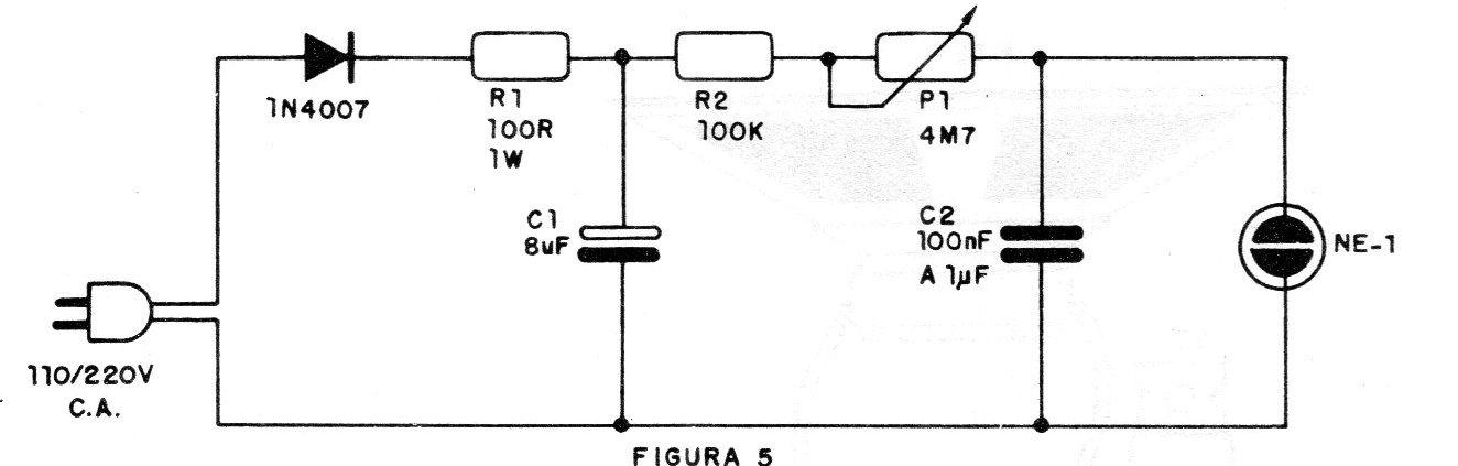 C2 carrega-se então exponencialmente através de R2/P1, até ser atingida a tensão de disparo da lâmpada neon.