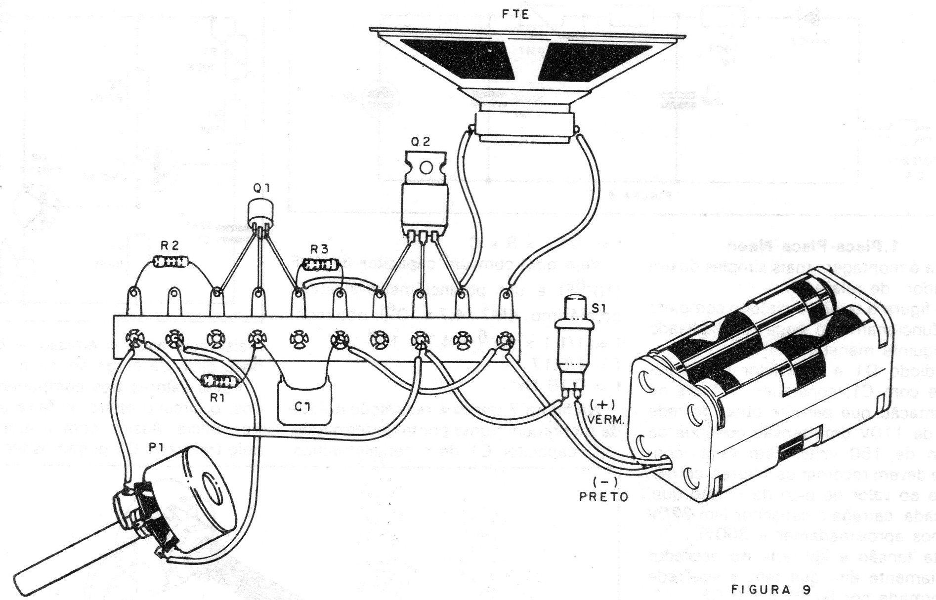 Pelos valores dos componentes usados, o circuito opera na faixa de áudio-frequência. Assim, com a amplificação pelo transistor Q2 podemos ter um sinal suficientemente intenso para ser levado a um alto-falante.