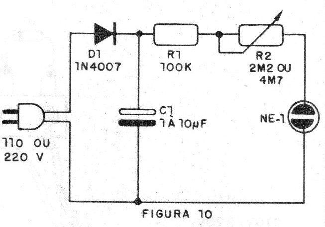 Este circuito funciona da seguinte maneira: quando ligamos a unidade na rede de 110 V, o capacitor C1 de 1 a 10 uF carrega-se com uma tensão de 150 volts aproximadamente.
