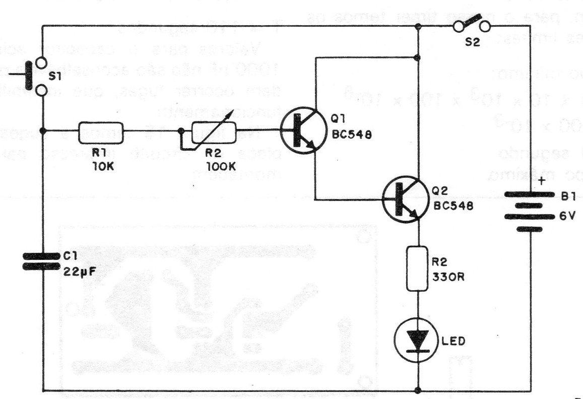 O funcionamento é o seguinte: quando apertamos S1, o capacitor C1 carrega-se com a tensão da bateria (6 V), passando em seguida a descarregar-se via R1, R2 e pelos circuitos de base dos transistores além de R3 e o LED..