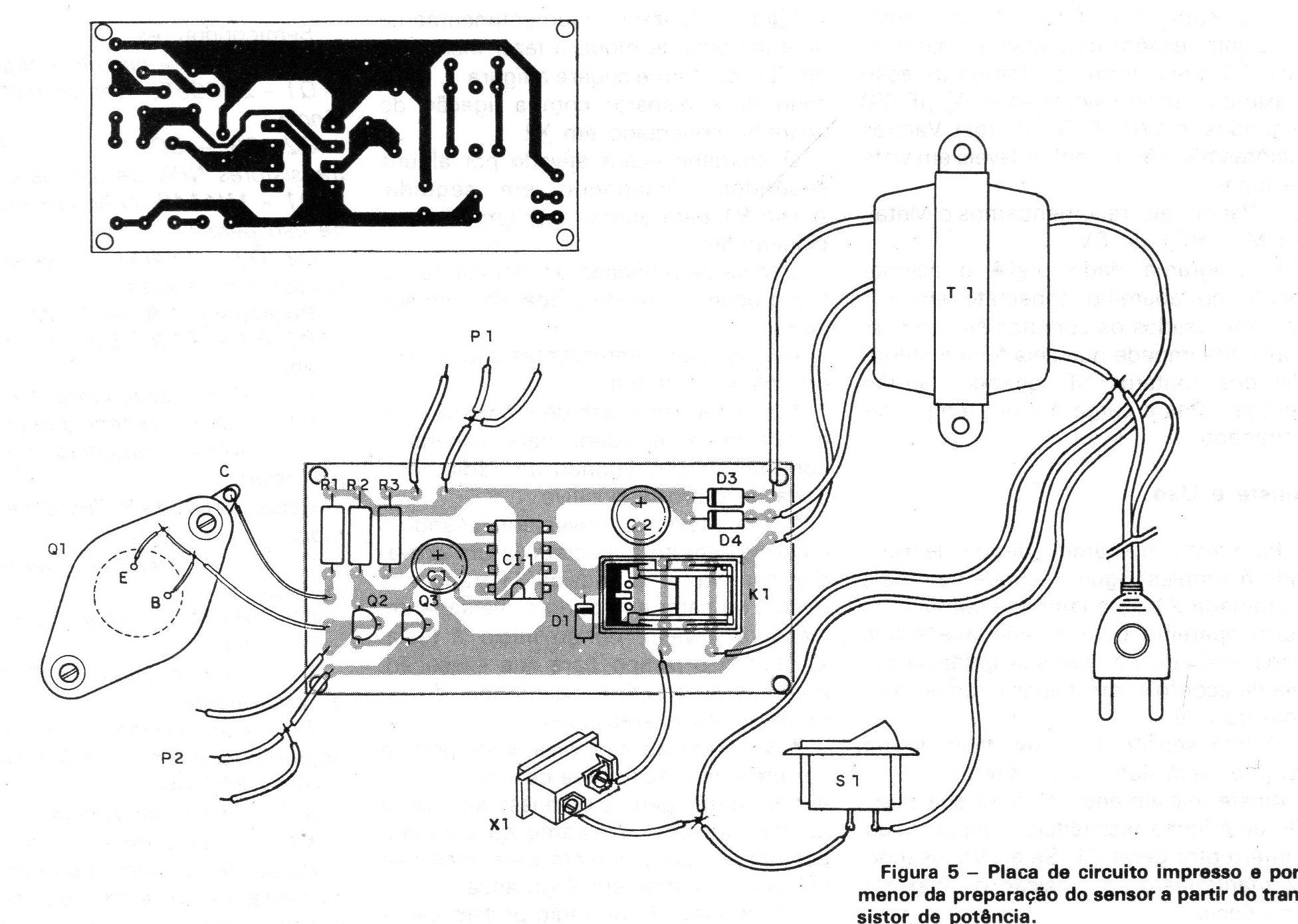 Agora, focalizando momentaneamente uma lanterna de modo a fazer incidir luz em Q1, conforme sugere a figura 7, o circuito deve disparar com a ligação do aparelho conectado em X1.