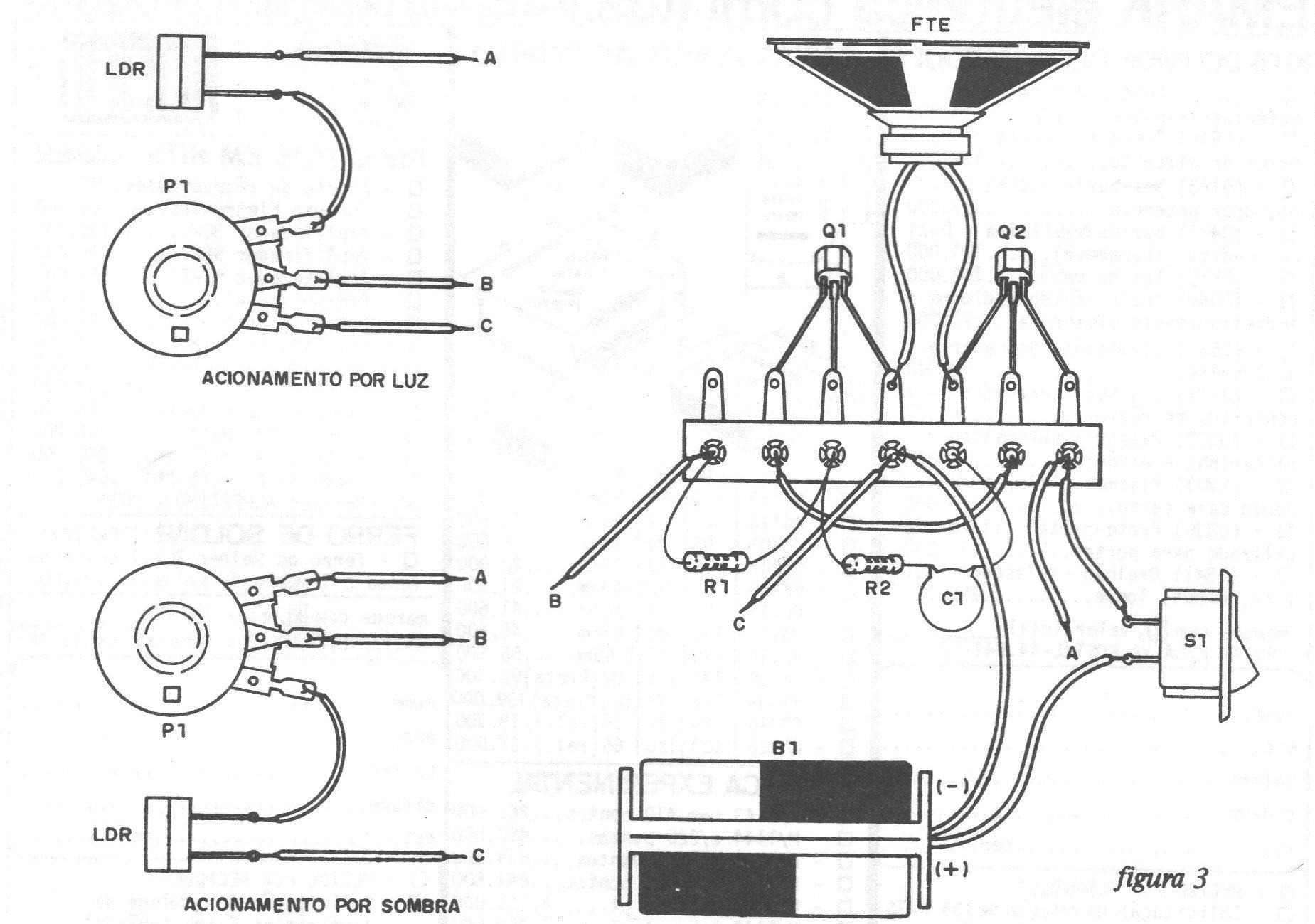 Na figura 4 damos um exemplo de alarme experimental de passagem que opera quando o feixe de luz da lâmpada como é interrompido.