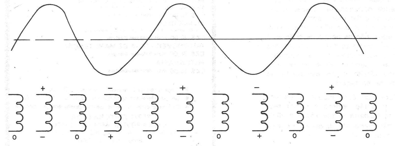 Se a corrente é alternada, o campo magnético produzido também tem suas linhas de força orientadas em sentido que muda constantemente, e nas mudanças de semiciclo, este campo desaparece totalmente.