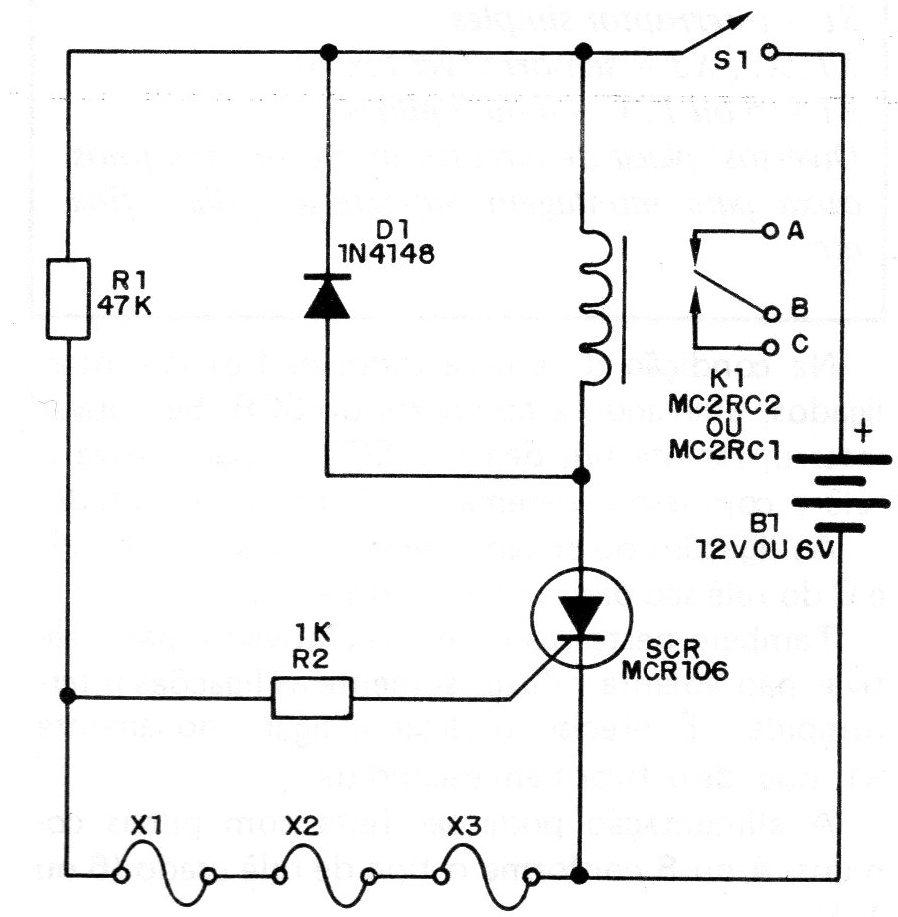 Na condição de espera todos os fios são interligados, aterrando a comporta do SCR. Se houver interrupção de um deles, o SCR dispara, ativa o relê e com isso o sistema de alarme é alimentado.