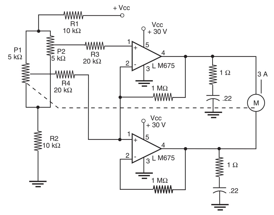 O circuito ilustrado pela Figura 1 é sugerido pela National Semiconductor e pode controlar um servo caseiro usando um motor com correntes de até 3 A. A base são dois amplificadores operacionais de potência LM675 conectados como comparadores. Quando você move P2 (o controle), o motor será energizado para atuar em P1 até que a tensão aplicada ao circuito atinja o mesmo valor da tensão aplicada por P2. Observe que P1 deve ser montado na caixa de mudanças onde o motor está instalado. O circuito pode operar com tensões iniciando em 6 V e pode ser adaptado para usar outros amplificadores operacionais de acordo com os requisitos do motor.