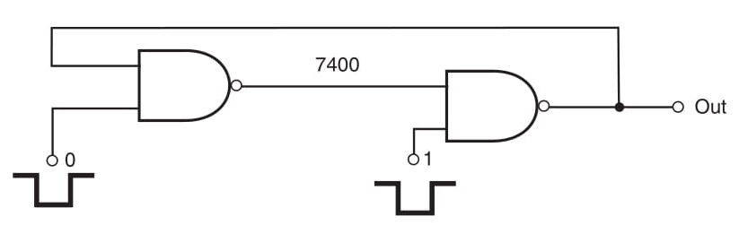 Outro circuito que pode ser usado como um condicionador de contato é mostrado na Figura 1. Esse bloco também usa ICs TTL e deve ser alimentado por uma fonte de alimentação de 5 V. O nível lógico das entradas determina o nível lógico de saída do circuito. Veja outros artigos nesta seção para circuitos que podem ser conduzidos por este circuito.