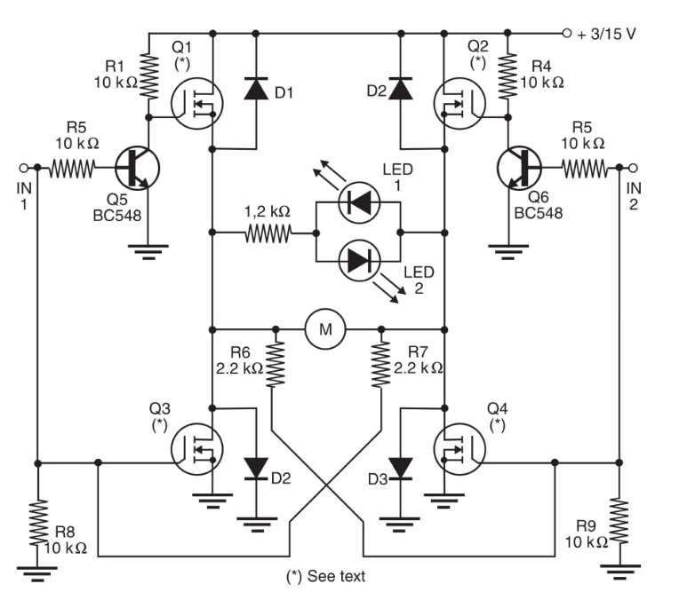 Este circuito (Figura 1) combina MOSFETs de potência com transistores bipolares comuns NPN e opera com duas entradas. Um circuito de feedback fornece proteção contra os estados proibidos. Quando esse estado é forçado pelas entradas, o feedback para a base de Q3 e Q4 não permite que elas sejam condutivas ao mesmo tempo.