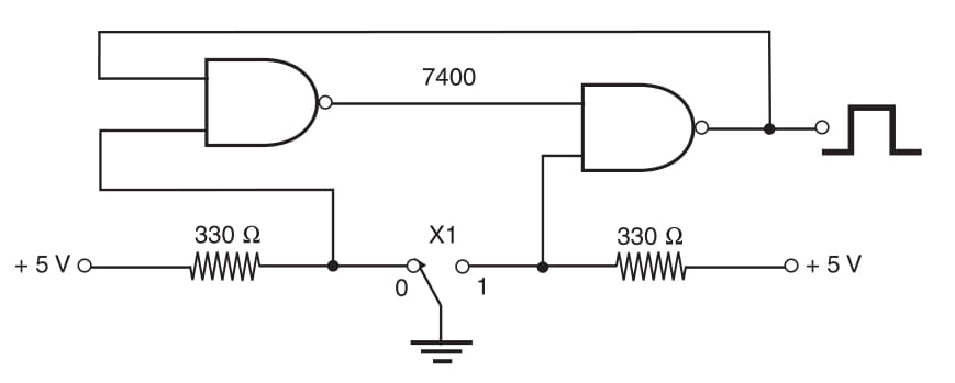 Dois sensores de contato operando como um comutador de polo único, duplo acionamento (SPDT) podem ser condicionados pelo circuito mostrado na Figura 1. Este circuito usa duas portas NAND de um 7400 TTL IC. A posição dos contatos determina se a saída do circuito vai para o nível lógico alto ou baixo.