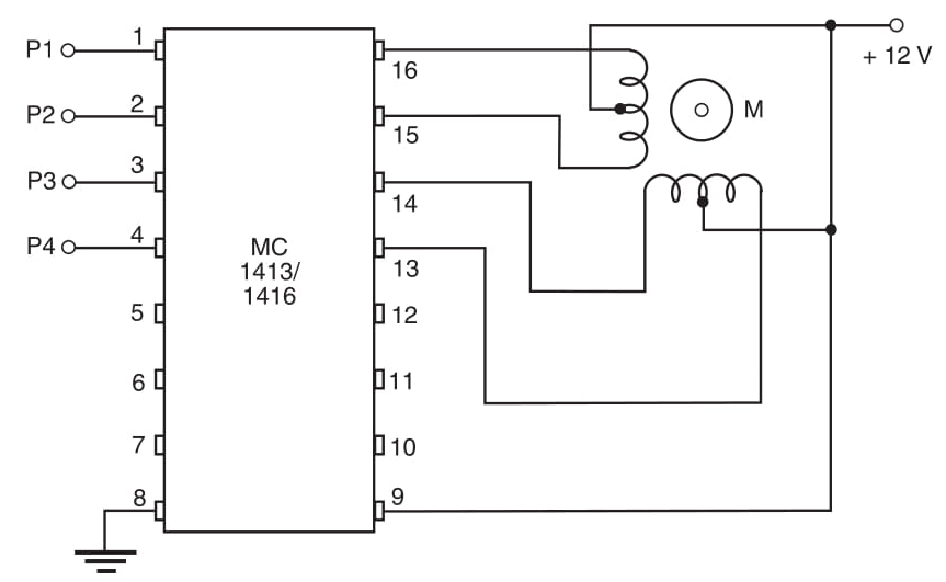 Os CIs MC1413 e MC1416, da Motorola, são equivalentes ao ULC2003 e podem ser usados para acionar motores de passo como mostrado na Figura 1. O MC1413 possui um circuito equivalente para cada estágio, como mostrado na Figura 8.20a, e o MC1416 tem o configuração mostrada na Figura 8.20b.