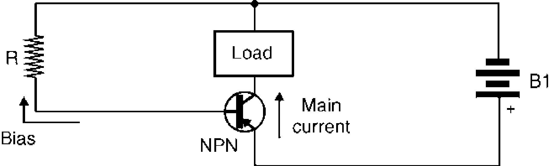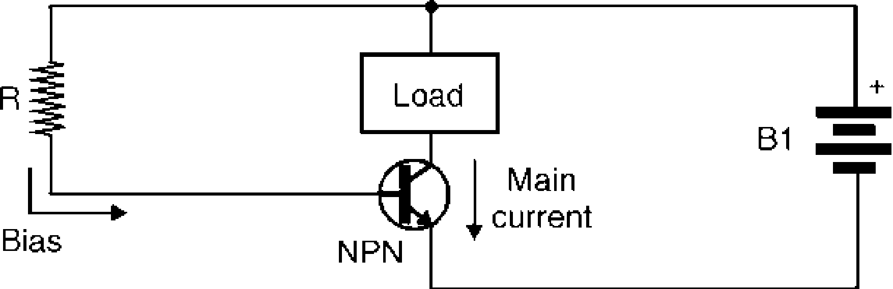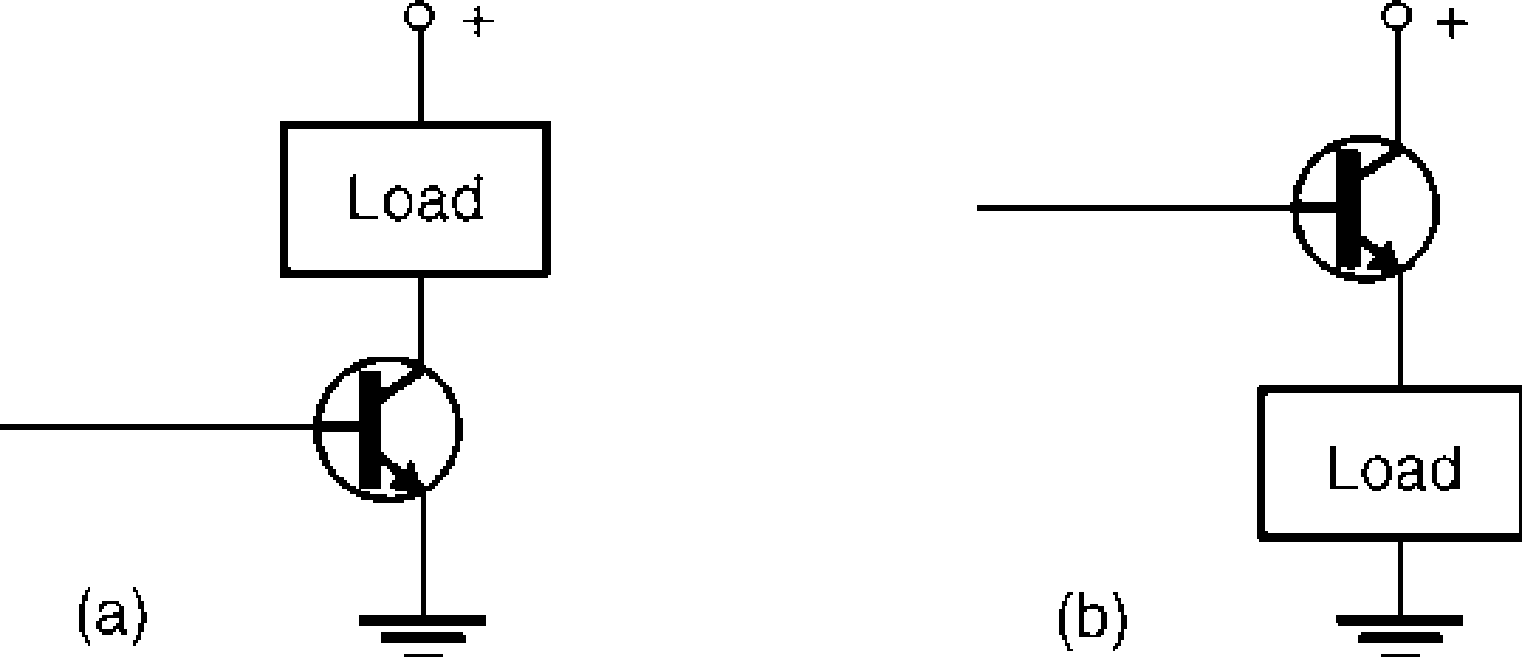 Por outro lado, o transistor PNP conduz uma grande corrente entre o emissor e o coletor (a direção inversa em comparação com um transistor NPN) quando a base é negativa em relação ao emissor, como mostra a Figura 3. A fonte de tensão deve ter o lado positivo conectado ao emissor e o negativo ao coletor. A carga a ser controlada por um transistor pode ser instalada entre o coletor e a fonte de alimentação ou entre o emissor e a fonte de alimentação, conforme mostrado na figura 4.