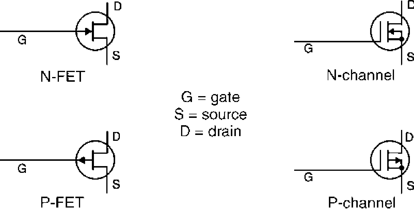Os transistores de efeito de campo são produzidos em quatro tipos básicos, como mostrado na Figura 5 Em 5a, vemos a junção FET (J-FET) e em 5b, nós representamos os dois tipos de transistores de efeito de campo semicondutor de óxido de metal (MOSFETs).