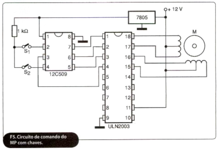 Note que temos um circuito regulador de tensão de 5 V que reduz os 12 V da fonte do motor para os 5 V necessários à alimentação do circuito lógico 12C509. As entradas não usadas deste circuito devem ser aterradas através de um resistor de 10k ohms para que as instabilidades de funcionamento sejam evitadas. O circuito integrado 7805 não precisará de radiador de calor, dada a baixa corrente que deve fornecer.