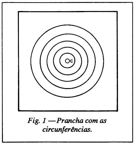 1 - Com uma prancha de madeira, medindo no mínimo 700 x 700 mm, tendo uma face preparada com tinta fosca de preferência na cor azul claro, trace pelo menos cinco circunferências concêntricas, com traço fino, firme e bastante vivo, usando como raio maior 330 mm e com separação de 66 mm para as cinco circunferências concêntricas. (Pode traçar maior número de circunferências se desejar). Escolha um lugar com boa insolação, no intervalo de 8 horas da manhã até 4 horas da tarde. Instale prancha bem fixa e nivelada. No centro desta, no ponto “c” fig. 1, instale um estilete, com o diâmetro máximo de 3 mm. Tomar o cuidado de deixar a prancha bem fixa e rigorosamente nivelada, como também o estilete rigorosamente na vertical.