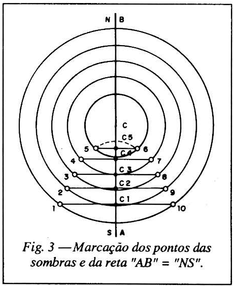 2 - Fixada a prancha conforme o descrito, estando o Sol limpo sem nenhuma nuvem no céu, vá observando a trajetória da ponta da sombra do estilete sobre a prancha. Quando a ponta da sombra tocar a primeira circunferência, marca-se um ponto neste local com um lápis. Continuando a observar a trajetória da sombra, vá marcando sobre todas as circunferências os novos pontos surgidos. Ver a fig. 2. Consultando o relógio, faltando 40 minutos para o meio-dia, vá marcando o extremo da sombra a cada 5 minutos ou tempo menor, como de 3 em 3 minutos. Esta marcação deverá ter uma simetria de tempo, isto é, começando a marcar faltando 40 minutos para meio-dia, continuar marcando até 40 minutos depois do meio-dia.