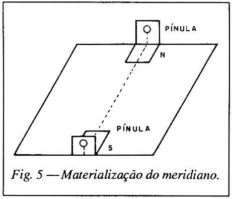 5 - Para deixar materializado o meridiano local, poderá usar o recurso mostrado na fig. 5, que consiste em duas pínulas metálicas com furos que servem de pontaria na materialização dos pontos, isto será de grande valia para futuras orientações, após a retirada da prancha.
