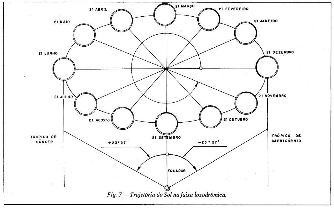 No dia 21 de dezembro, encontra-se no solstício de inverno, ponto mais meridional e que é o trópico de Capricórnio. Em 184 dias o Sol oscila numa faixa angular de 23 graus e 27 minutos para o Norte e 23 graus e 27 minutos para o Sul, conforme mostra figura 7, não sendo uniforme esta variação.