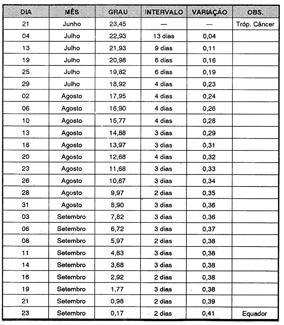 A tabela I (Variação da declinação do Sol), apresenta a variação angular partindo do trópico de Câncer até o Equador, fazendo notar a diferença dos intervalos e as variações diárias. Todos os valores angulares estão em graus decimais, e é mostrada na página seguinte.