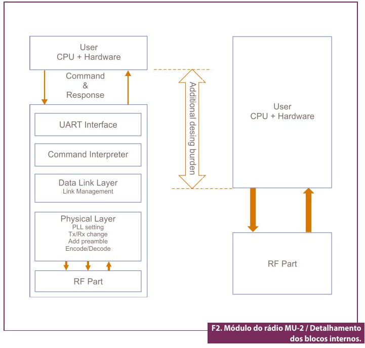 As figuras 1 e 2 mostram o módulo do rádio MU-2, da Circuit Design. Esse módulo utiliza a interface UART, de modo que a conexão com a UART da CPU (RS-232C) é simples. O MU-2-R usa correção de erro nível 4 tipo Reed-Solomon reduzida [RS(40,32;4)]. Ele tem, também, um modo que combinado com interleaving (intercalação), aumenta a recuperação para 25% (10% sem interleaving). A figura 3 é uma imagem de osciloscópio do impacto de efeitos (múltiplas trajetórias), quando o MU-2 se move nas proximidades — em um modo sem correção de erro.