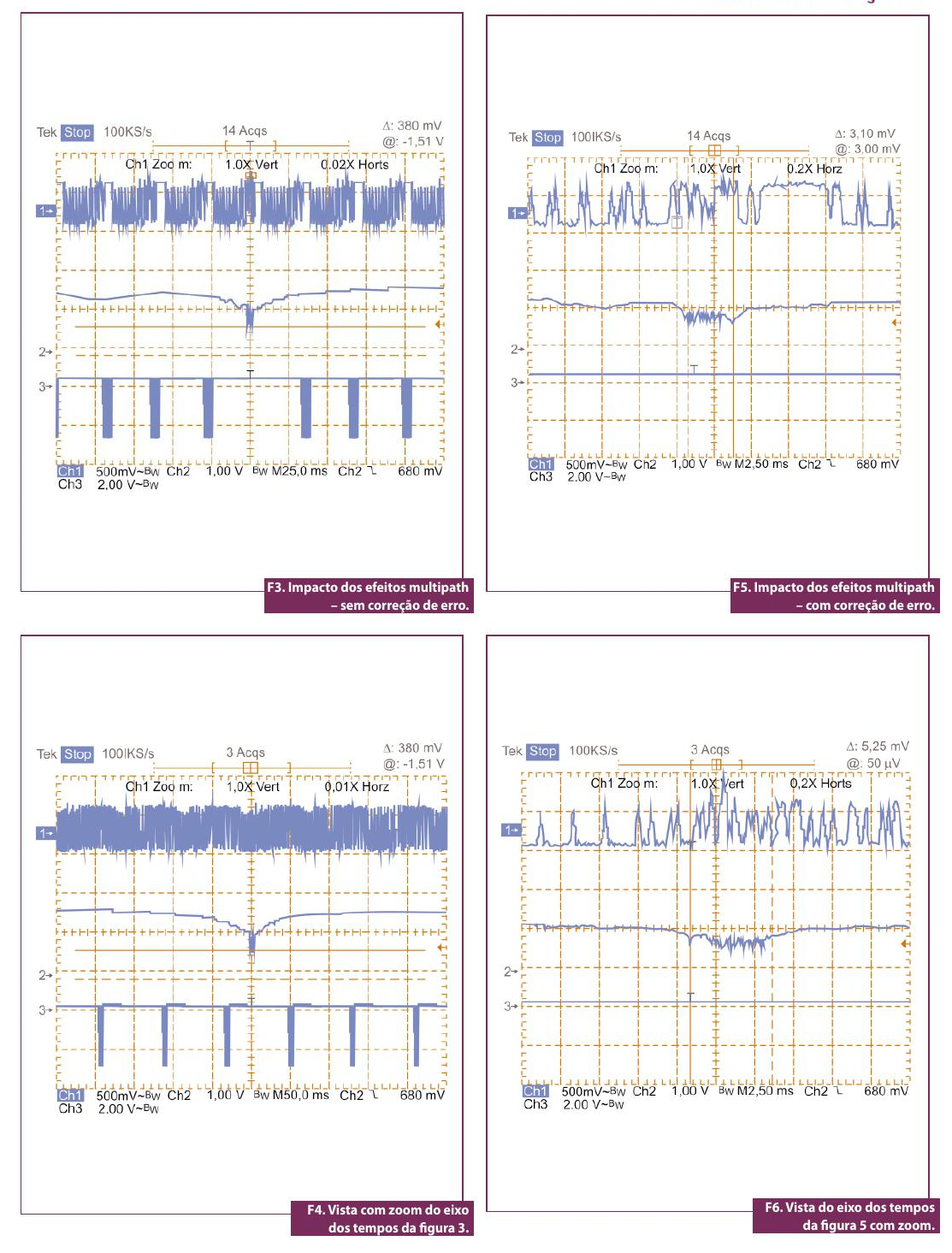 A figura 5 mostra uma imagem de osciloscópio do impacto de efeitos multipath (múltiplas trajetórias), quando o módulo é deslocado nas proximidades —em um modo com correção de erro. Neste caso, no meio das telas vistas nas figuras 5 e 6, aproximadamente 5,25ms dos dados recebidos foram perdidos, mas durante esse tempo a saída recebida foi recuperada normalmente. Isso demonstra a eficiência da correção de erro.