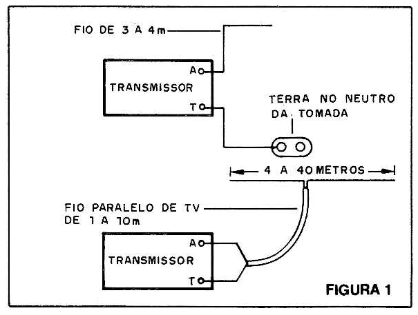 Para uma aplicação experimental com alcance menor, a antena pode ser um fio esticado de uns 3 ou 4 metros de comprimento e a ligação à terra pode ser feita no neutro da tomada ou, conforme mostra a fig. 1, numa antena dipolo.