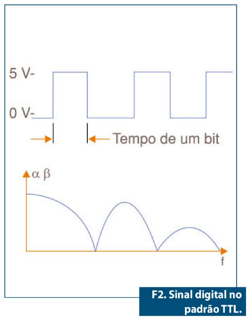 Em uma placa de circuitos digitais contendo portas lógicas os sinais obedecem ao padrão TTL, ou seja, possuem um nível DC e bordas abruptas de subida e descida, confinando a energia de um bit em uma janela finita no tempo (figura 2). Esse confinamento no tempo implica em uma grande ocupação do espectro.