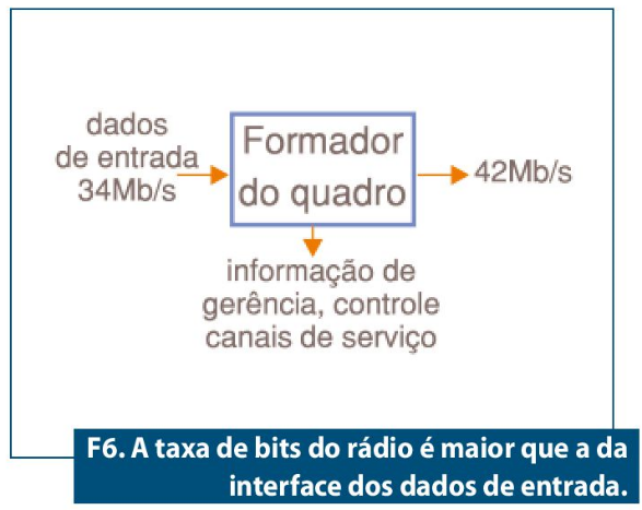 As principais funções desses bits de controle são a "palavra de alinhamento de quadro" do rádio para que no receptor o equipamento tenha condições de separar cada uma das informações, e os "bits de paridade" para controle da taxa de erro de bits, a principal medida de desempenho do sistema. É claro que para ser possível transportar tanta informação a mais, a taxa de bits interna do rádio é superior à da interface de dados de entrada, conforme indica a figura 6.