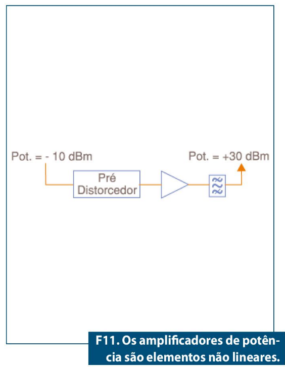 Como o próprio nome diz, este estágio amplifica o sinal para os níveis de alta potência que alimentarão a antena e o propagarão pela atmosfera até a antena receptora. Quanto mais complexa a modulação digital (número de pontos da constelação) maiores as exigências de linearidade dos sistemas de transmissão para uma correta detecção de bits (baixa taxa de erro). Os amplificadores são elementos não lineares quando operam com grandes sinais (figura 11).