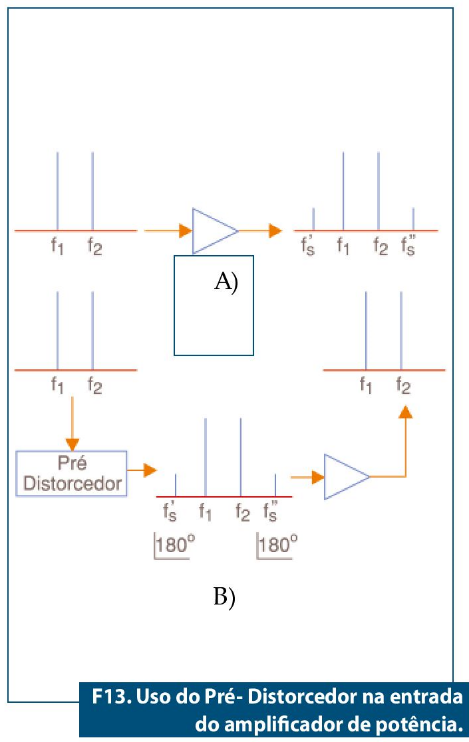 A ideia por trás desse dispositivo é adicionar à entrada do amplificador um sinal intermodulado controlado, com uma fase tal que quando o sinal for amplificado, na saída tem-se o cancelamento dos sinais f' e f" (figura 13 a e figura 13 b), ou seja, o sinal gerado internamente pela intermodulação do amplificador (fs' e fs") e o sinal de saída gerado pela amplificação do sinal de entrada (fs' e fs") estão em oposição de fase (figura 14).