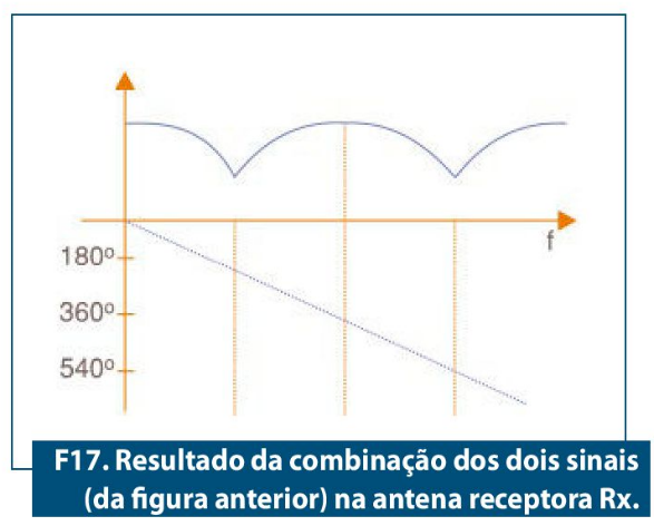 Nas frequências onde a diferença de atraso equivale à diferença de fase de 180° o sinal sofre forte atenuação, já nas frequências em que a diferença de fase equivale a O° o sinal sofre um reforço. Nos casos de forte atenuação, o espectro do sinal recebido é fortemente distorcido. (Figura 18)
