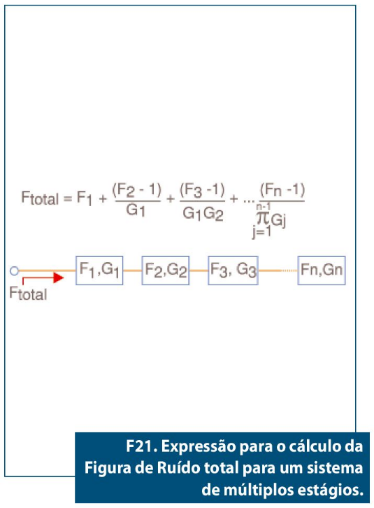 Para efeito de cálculo do sistema, todos os ruídos de estágios posteriores são representados somente na entrada do receptor (figura de ruído do receptor). A expressão matemática para cálculo de figura de ruído total para um sistema de múltiplos estágios com ganho Gj e figura de ruído Fj é dada na figura 21.