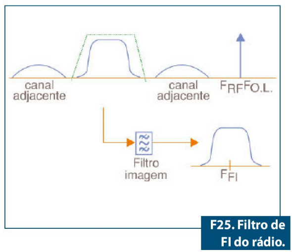 Este filtro determina a seletividade do rádio e a sua banda de ruído. Cabe a ele eliminar qualquer vazamento de O.L. ou de RF para o estágio de FI, e também filtrar os sinais de canais adjacentes que não foram totalmente eliminados pelo filtro de canal do estágio de RF (figura 25).