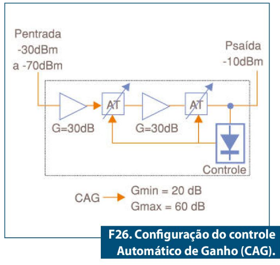 Para a correta demodulação do sinal, o mesmo deve ter um nível constante na entrada do demodulador. Portanto, o ganho deste estágio é controlado dinamicamente para que o nível de saída do mesmo seja constante. Isto é realizado monitorando-se o nível de saída e um circuito de controle ajusta os atenuadores internos deste estágio (configuração parecida com a da figura 26).