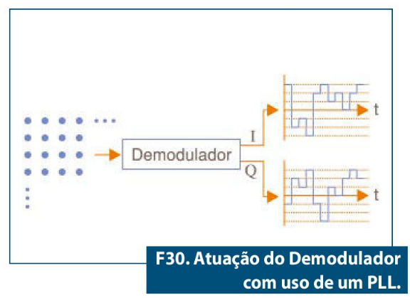 O demodulador converte o sinal modulado (constelação QAM) nos dois feixes de dados correspondentes às subportadoras 1 e Q. Para isso é preciso, através de um PLL, recuperar estas subportadoras (figura 30).
