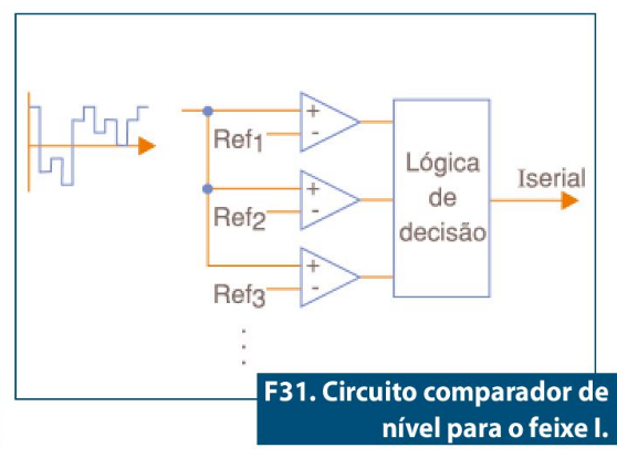 Circuitos comparadores de nível identificam os níveis dos sinais (I e Q) e, conforme o resultado, geram a sequência de bits do feixe I e do feixe Q (a figura 31 apresenta apenas o feixe I, de maneira análoga se obtém o feixe Q).