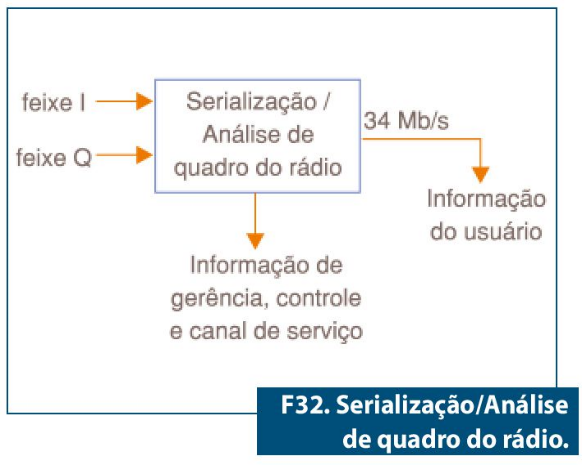 Aplicando a lógica reversa do circuito do transmissor, os feixes I e Q são combinados em um único feixe e os bits de informação do quadro do rádio são entregues ao microprocessador para informações de gerência e controle, conforme foi explicado anteriormente. (Figura 32).